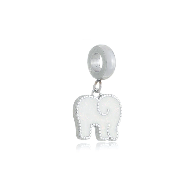 Berloque penduricalho, com pingente elefante resinado em branco e detalhes brilho furta cor.